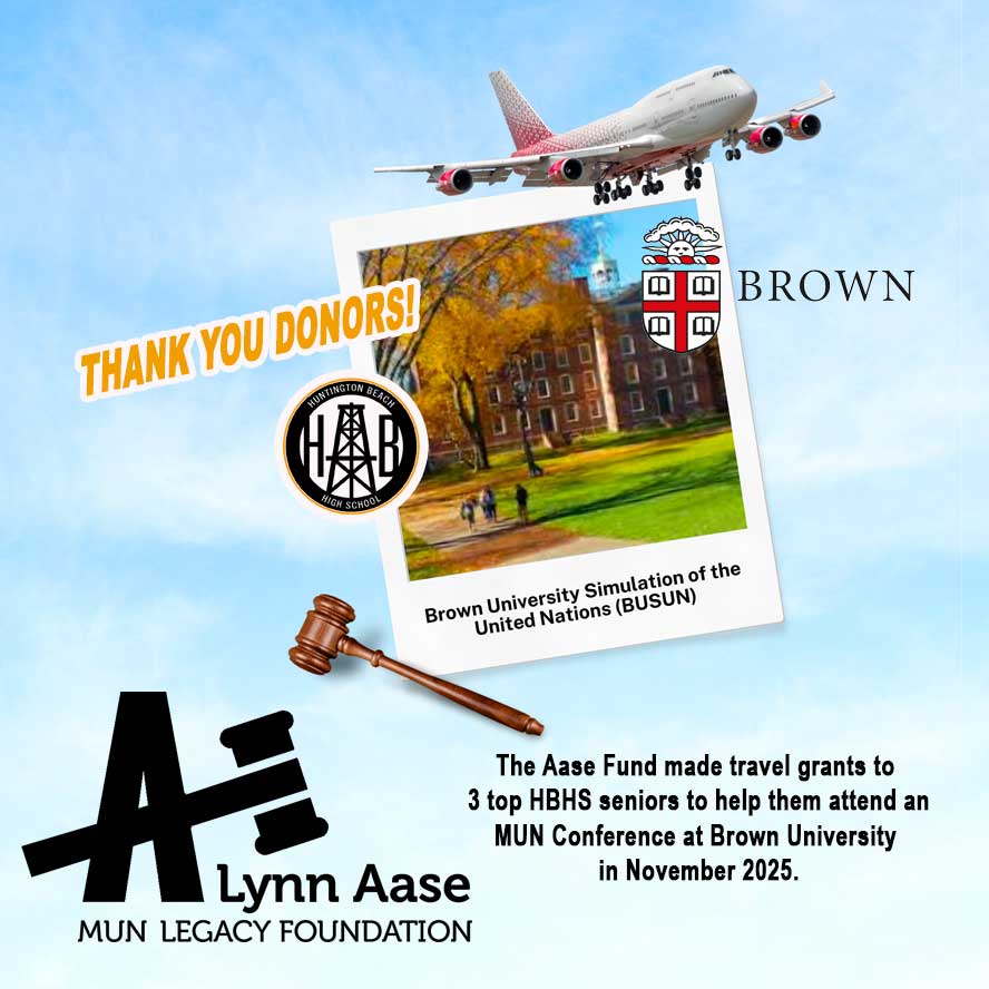 On behalf of our generous donors, the board of the Lynn Aase MUN Legacy Foundation is pleased to announce that we have awarded the following travel grants to assist top students in the Model United Nations program at Huntington Beach High School.