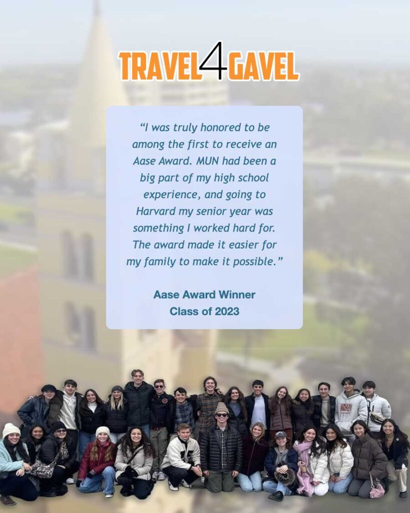 The Aase Fund was started by alumni of Huntington Beach High School to honor Lynn Aase, founder of HBHS’s powerhouse Model United Nations program. Thanks to our generous donors, we exceeded our goal of raising $50,000 by the program’s 50th anniversary in 2023 enabling us to start a capital fund and award our first Travel Grants